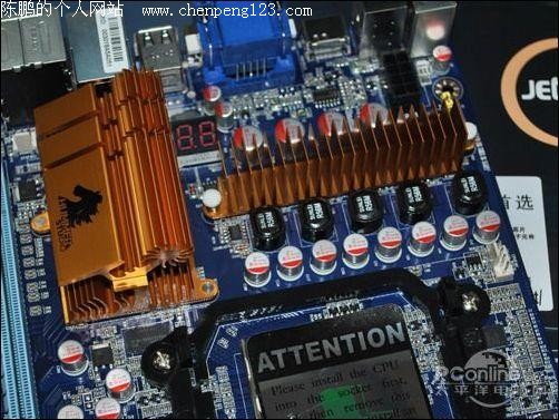 供电部分,捷波 悍马HZ02采用了4+1相分离式供电设计,使用了全固态电容,搭配全封闭电感,每相供电使用了2个mosfet,且都有散热片覆盖,这样的供电设计无疑能给主板带来更加稳定的电流,方便发挥各部分元件更大的超频潜力,将悍马的辉煌完美延续。