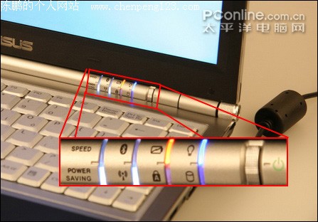 快捷键和状态指示灯被非常巧妙地设置在转轴圆柱上,用户在使用电脑时能实时掌握笔记本的运行状态,同时在合上屏盖后仍然了解笔记本的运行情况。转轴圆柱左边设置了启动能源管理工具和启动Splendid智能影像技术两个快捷键和一个麦克风拾音孔,而右边则设置有两排一共8个指示灯和一个开机按键,第一列指示灯为显卡选择状态显示,上面为选择8400MGS独立显卡,下面为选择集成显卡;第二列上面为开启蓝牙,下面为开启无线网卡;第三列上面为电池充电状态,下面为大小写字母状态;第四列上面为电源状态,下面为硬盘转动。