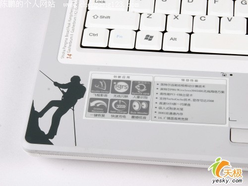 配置方面,天逸F40雪山版采用了英特尔Core 2 Duo T5500双核处理器,主频1.66GHz,2MB二级缓存。基于英特尔945PM芯片组设计,内置512MB DDR2内存,128MB显存nVidia GeForce Go7300独立显卡,80G SATA硬盘,吸入式COMBO刻录光驱,14.1英寸WXGA镜面高亮宽屏,内建百兆网卡和英特尔PRO/Wireless 3945ABG无线网卡。