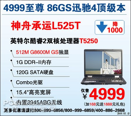 神舟推出的512MB DDR3显存86GS独显配T5250无线本——神舟 承运L525T再战4999笔记本市场,堪称完美的它提供了T5250酷睿双核处理器、1GB内存、GF8600m GS独立显卡、15.4寸高亮宽屏、120G SATA硬盘、Combo刻录光驱等,势必再掀抢购风潮!
