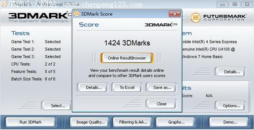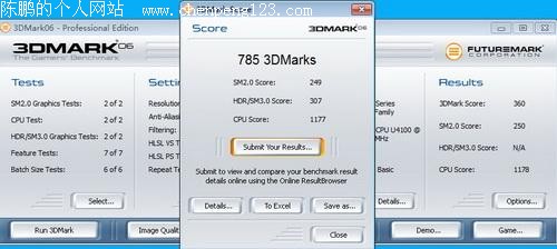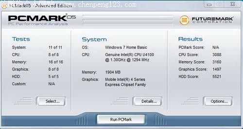 在PCMark 05中,我们并没有跑出总分。这可能是由于软件之间冲突的原因造成的。不过,通过对子项分数的考量我们也能看出,该机除了显示方面,其他性能还是比较均衡的状态,日常使用绝无问题。