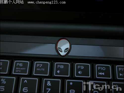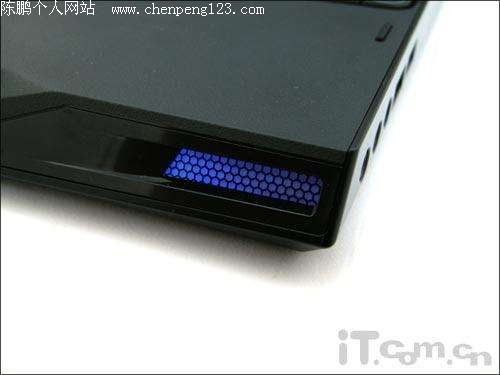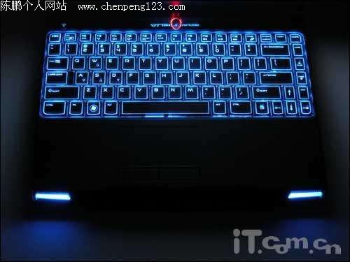 Alienware设计风格的另一个基本要素就是笔记本电脑各处LED灯的个性化。首先,大多数人注意到的是华丽的背光键盘和两个前面板,但我个人最喜欢的是背光键盘上方的外星人脑袋。使用AlienFX软件,你可以设置M11x的这个LED灯按电池的电量状态发出不一样的亮度的光。我自己的设置方式是,接交流电源时发蓝光,用电池时发红光。如果电源线是在比赛中意外拔出,这是一个很好的提醒用户的方式。M11x另外还有两个LED灯,一个是屏幕背面的外星人头,一个是笔记本电脑底部的出风口。不过这两个地方不能用AlienFX软件设置,通风口使用与键盘同样的光,屏幕上的外星人LOGO则与液晶面板的背光灯一起,只有开机才亮。