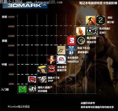 全新的显卡阶梯图介绍:目前越来越多的用户都很关注笔记本的显卡3D效能,但是看过了3Dmark 06测试成绩之后并不能非常白的了解该显卡能运行什么游戏。该阶梯图也是想让更多的网友大概的了解您的显卡能运行哪类游戏。注(具体的测试成绩与处理器内存均息息相关),仅供参考,本次评测的VAIO E的3D测试成绩为7325分,以下图表大家可以参考。