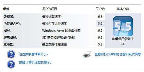VAIO E整机WIN7自检性能来看整机5.5的得分出自于内存得分,建议用户升级内存至4G取得更好的内存性能,6.2的图形显卡得分表现令人满意。