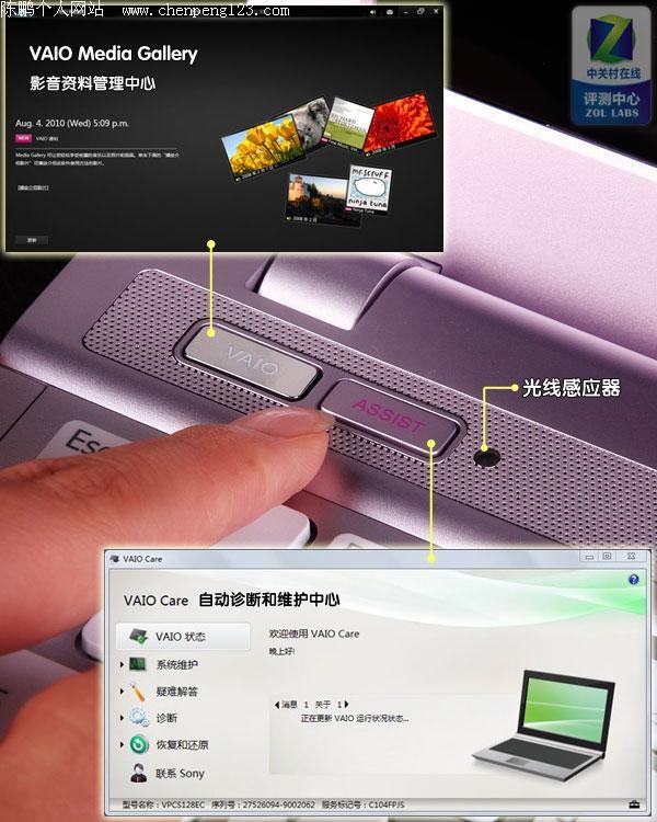 在这方面,S128也做的不错,为两款自主研发的特色软件设计了快捷键,用户只需摁下按键即可打开相应软件。其中 Media Gallery可以帮助我们归纳整理各种照片、视频和音乐资料,便于日后查找;VAIO Care则是一款对初学者来说非常实用的软件,当我们感觉电脑不太好用时,它可以给本本做“体检”,查找故障原因然后自动解决问题,省时又省心。