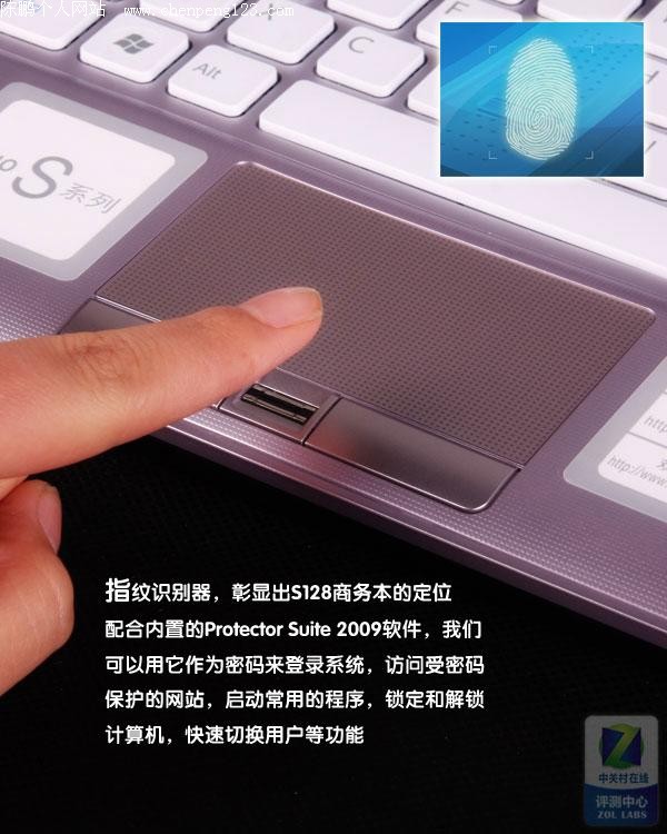 指纹识别功能,简而言之,就是给笔记本的数据加了一把锁,通过S128内置的Protector Suit软件,初学者可以观看演示视频,然后跟着向导一步步完成设置,这里就不再赘述了。