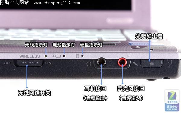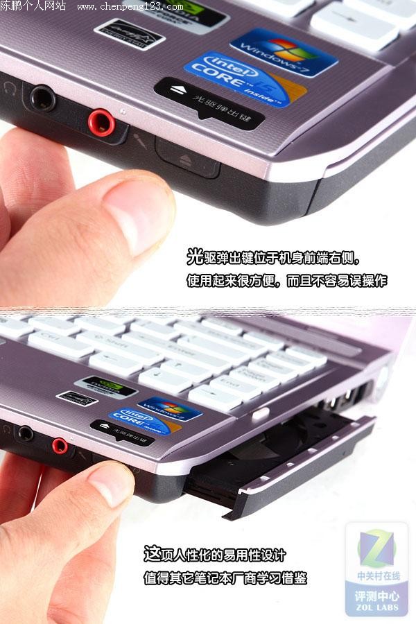 当我把这款S128拿在手中把玩时,很快就注意到了它的前置光驱弹出键,试用了一下,感到既方便,又不容易误操作,实在是很人性化的设计。此外,还听说这种设计能够减少光驱本身的厚度,从而让整个笔记本也可以更薄一点。
