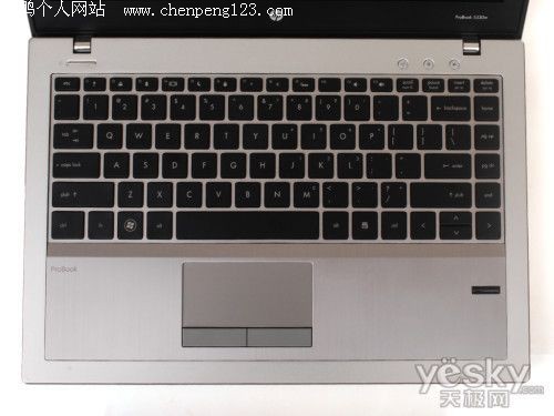 再来看看惠普ProBook 5330m的键盘面,一块黑色的巧克力键盘嵌在银色的金属面板下,键盘上的功能键键帽面积略小,电源按钮和3个快捷键分别在键盘上方的左右两侧,键盘下方 设计了一块面积适中的触摸板,右下角有指纹识别装置,掌托上没有任何标签。惠普5330m的键盘面布局十分紧凑,黑色与银色的对比非常干净。