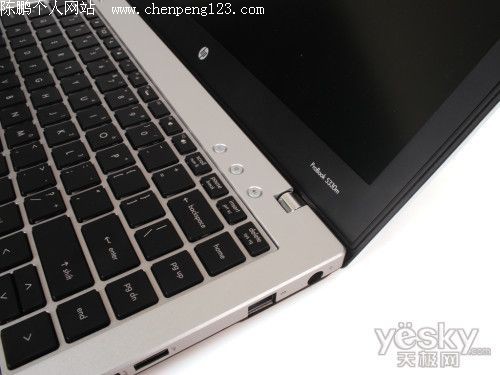 惠普ProBook 5330m键盘的左上角有一个长方形条状的电源按钮,在电源按钮上左侧有一颗LED指示灯用于表示笔记本开关机状态。但笔者在实际使用的过程中认为这颗LED指示灯实在太小,仅针孔一般大小,白天使用时除非从正上方向下看,否则不容易分辨。