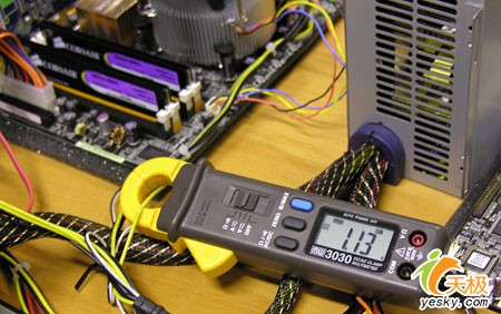 这一次我们通过主板电源的 ATX12V接口直接测试,这样我们就可以直接测试处理器的功耗。一旦当你获得数据之后,只需要经过简单计算就能够将功耗换算成W。当然这种测试获得的数据在准确度上并不是100%,但是基本上来说是与实际功耗十分接近的。