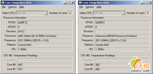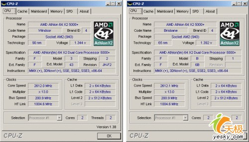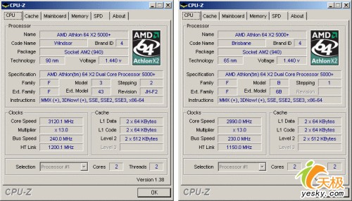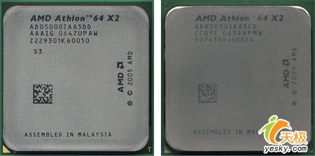 如果单纯依靠处理器的OPN编码是很难将65nm处理器与90nm处理器区分开来的,因为这两款处理器都采用了相似的P-Rating命名法,在这里二者之间最大的不同就在于只有65nm 5000+处理器(左边那个)的功耗为65W。