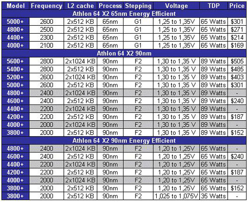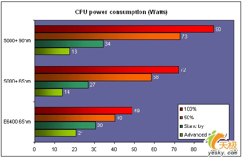 更先进的生产工艺还将会给电子管的性能带来提升,特别是最为重要的功耗。不过在这一点上AMD公司似乎并没有做得很好,因为新款处理器的TDP为65W。我们都知道最初版本的 Athlon 64 X2处理器的TDP为89W,而且AMD公司在此之前也推出了节能版的Athlon 64 X2处理器,比如节能版4800+处理器。新款65nm处理器将会被打上5000+的标识,但是该处理器的TDP却并不是我们期望中的35W。