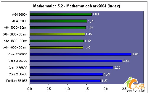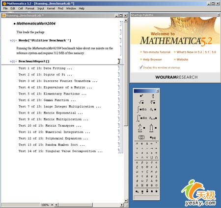 在科学计算测试中,我们选用的是 Wolfram Research Mathematica 5.2. 以及 MathematicaMark2004