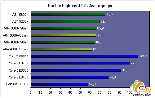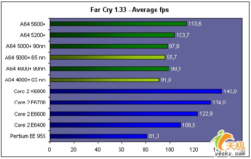在使用65nm的工艺之后,反而在 Far Cry中带来了负面效果,特别是 4800+处理器。主要原因是在这里二级缓存的性能的重要性要高于处理器的核心频率。
