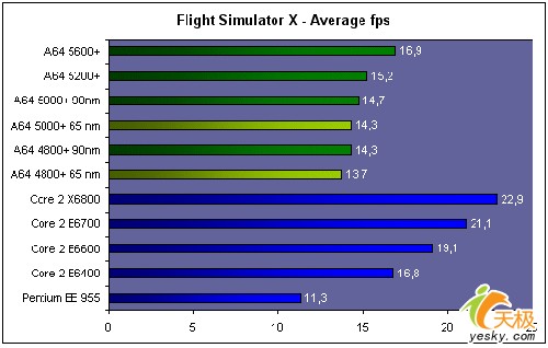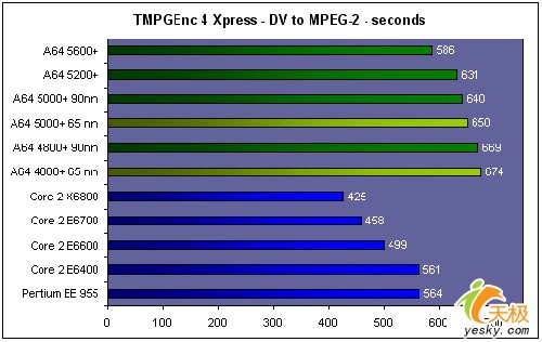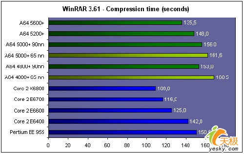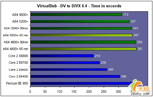 在转入65nm制程之后,似乎并没有为AMD在性能上带来任何改善。在这项测试中,也就只有5600+能够与 E6400比试一番。