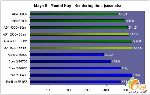 在这项测试中,Athlon 64 X2 5000+的速度与 E6400的速度是相同的,而在Maya测试中我们可以看到新款65nm处理器的性能大约在E6400 和 E6600之间。