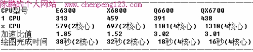 CINEBENCH 9.5软件的另一个测试重点,是比较单一核心与多个核心的性能差距。从测试结果表中可知,E6300的加速比是1.86倍,X6800是1.52倍,两款四核心处理器则都是3倍的加速比。即使不是2+2=4,但有3倍的性能也够让人满意了。