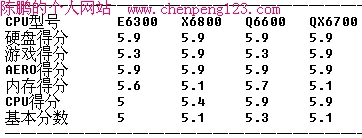 以本文使用的Q6600处理器测试平台为例,处理器、图形(Aero透明玻璃界面)、硬盘等三项都直接达到满分。内存稍低一点,得到5.7分,游戏图形最低,但也得了5.3分。(中端显卡7600GT看来已经配不上Q6600平台了)。