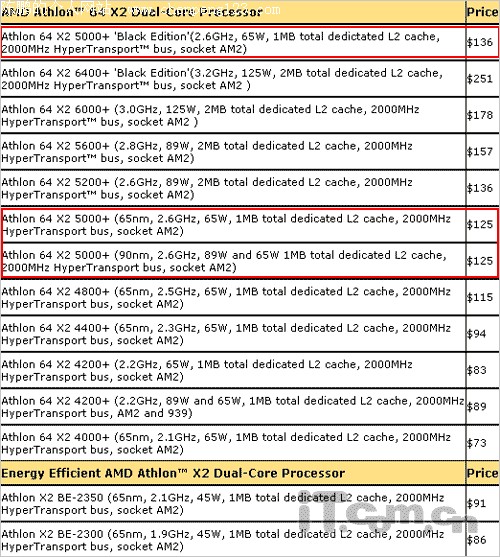 在首先拿到黑盒版本的国外网站的测试数据中,黑盒版本的5000+ 处理器的超值程度比较明显。从上边的最新官方价格表可以看到,AMD 面向桌面的中高端处理器已经增添了一款5000+,而且位置上甚至比之前的黑盒版本6400+ 更高!