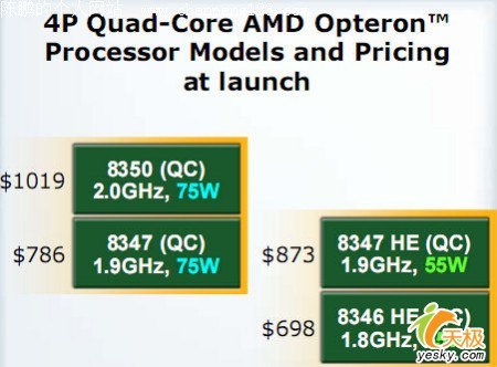 在正式开始性能测试之前,我们先介绍一下新处理器的产品布局以及价格情况。AMD这一次将会同时推出 4/8-way (4S)和 2-way (2S)四核心Opteron处理器,核心频率从1.7GHz 到 2GHz。首先我们先了解一下4S系列产品