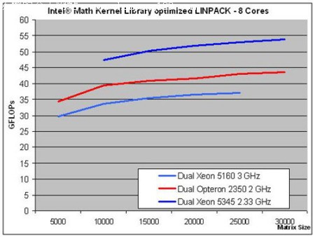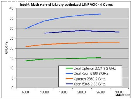 最新的Opteron处理器在这里表现错,性能与2.4GHz的Clovertown差不多。不过其性能仍然要落后于880 Opteron,但是相比而言880 Opteron的核心频率要更高。
