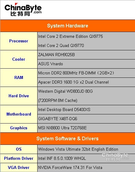 为了能够更清楚的了解到Intel Skulltrail平台的性能表现,我们同时选择了Intel Core 2 Quad QX9650处理器和GIGABYTE X48T-DQ6主板相结合的测试平台来进行对比测试。两个平台具体的配置信息如下表所示。