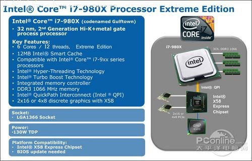 Core i7 980X仍采用LGA1366接口,并支持VRD 11.1供电规范,与主板芯片组采用QPI总线进行通讯,因此将完全兼容X58主板芯片组。当i7 980X发布后,当前市售的X58主板只需要刷写最新BIOS即可支持该CPU,对于X58用户来说这是好消息。