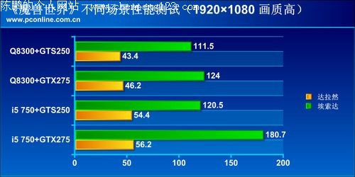 为了分别考察CPU和显卡性能对于游戏流畅度的影响,所以我们选择了Intel Core i5 750和Intel Core 2 Quad Q8300两颗四核处理器以及GTX275和GTS250两款显卡,并且选择交叉组建平台的方式,考察不同的组合所发挥的性能差异。
