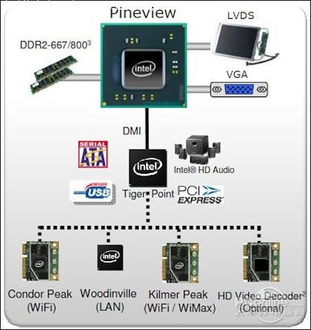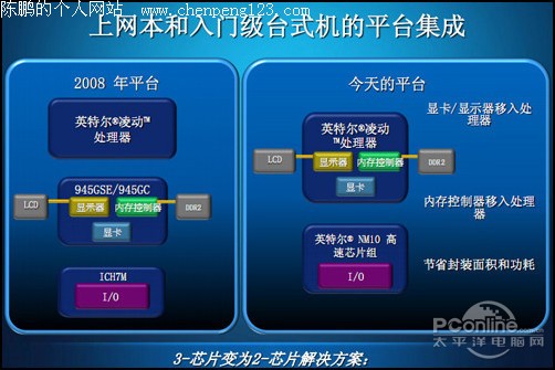 与之前采用N270、N280单核处理器的凌动平台相比,新的凌动平台最大变化就是把N450处理器与北桥芯片整合在一起,而原有的ICH7M南桥芯片组则更名为NM10高速芯片组。
