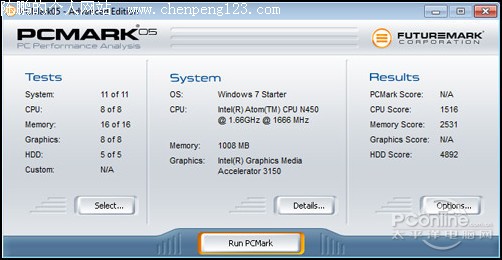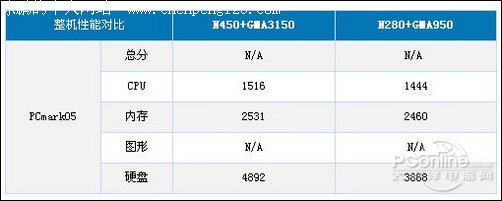 从玩家PCMark05评测的数据可以发现新一代Atom N450只比老Atom N280高了72分,提升可以用忽略不计来形容,更谈不上跟CULV抗衡。