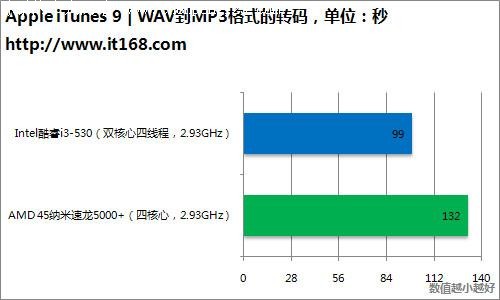 这部分测试应用到的软件也都是支持多线程的,不过“原生”四核心的AMD速龙II5000+显然要比双核心四线程的酷睿i3-530更快些。流行的苹果iTunes播放器自带了音频转档功能,i3-530也保住了这个Intel的强项。