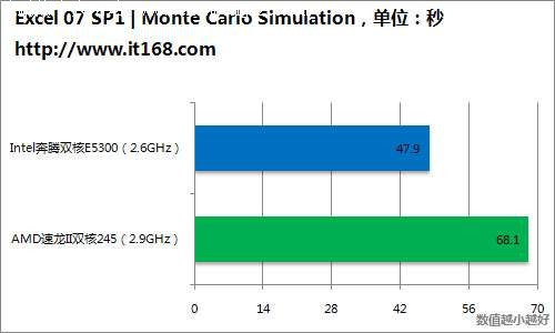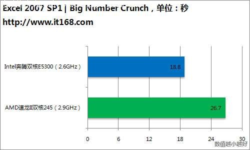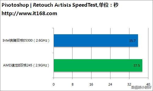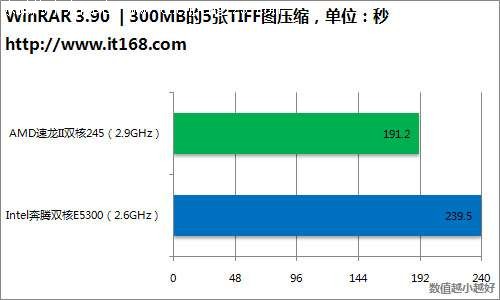 在办公性能测试中,轮到Intel奔腾双核E5300反过来以三比一取胜AMD速龙II双核245处理器,Excel表格计算和WinRAR图片压缩Intel和AMD分别大幅度领先对手,而Photoshop图片渲染E5300并不会比245快多少。