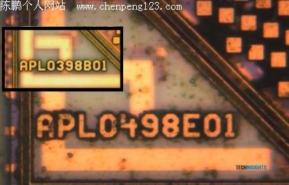 至于生产工艺,大致推测A5处理器所用的为45nm制程,A4处理器编号为:APL0398B01,而A5处理器编号为:APL0498E01。UBM TechInsights采用了光学放大与扫描电子显微镜结合的方法分析了两款处理器的异同之处,涉及的项目包括metal1互联层节距,逻辑/SRAM 电路用晶体管结构,核心封装方式等等,并将A5的有关测试数据与三星其它45nm产品进行了对比。