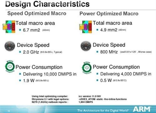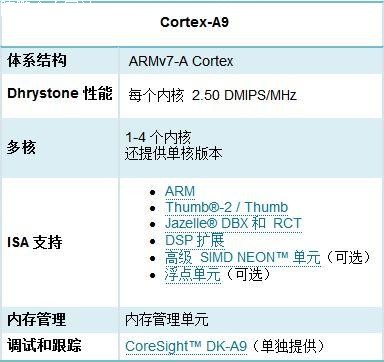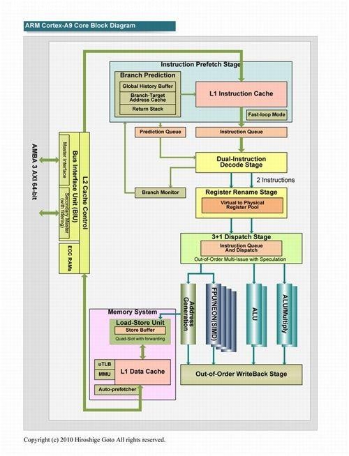 这个所带来的影响程序,可以通过Cortex-A9所占据的核心区域来了解。通过ARM公司在去年(2010年)的“CMP Conference”所进行的演示,在使用台积电 40nm工艺的双核心Cortex-A9的核心面积约在6.7平方毫米,其频率目标为2GHz,1.9W功耗,这里还包括了L1缓存和总线接口。