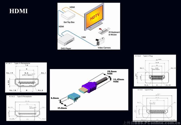 HDMI是目前最有前途的接口标准,同基本兼容DVI-D,通过简单得连线可以互换,并且可以同事传输较高质量的音频信号。