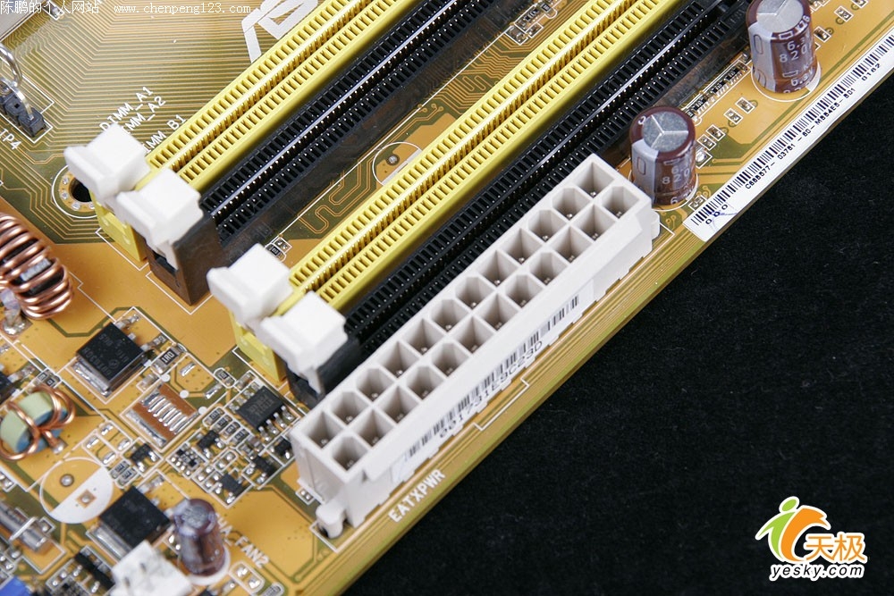 在主板上,我们可以看到一个长方形的插槽,这个插槽就是电源为主板提供供电的插槽(如下图)。目前主板供电的接口主要有24针与 20针两种,在中高端的主板上,一般都采用24PIN的主板供电接口设计,低端的产品一般为20PIN。不论采用24PIN和20PIN,其插法都是一样的 。