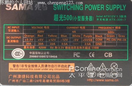 从先马 超光500(ATX-330-7)电源的铭牌上可以看到该产品的相关参数,适应电压220v,单路+12V:22A,+3.3V:30A,+5V:30A,额定输出420w左右,符合ATX +12V 1.3规范,但比较遗憾的是在铭牌上看不到产品的额定功率。