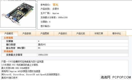 只需要一个 PCI 插槽,就可以延伸出四个显示器。这款 PCI 接口的设备,目前兼容的大部分台式计算机,最大支持 64MB DDR SGRAM 显存,使用两个 Appian AGX 多屏显示图形加速器,其 DirectX, DirectDraw, Direct3D and OpenGL 支持跨屏显示,集成 DVI 接口技术。