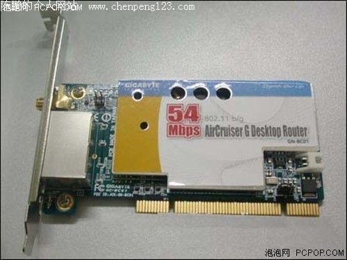这款产品是技嘉 GN-BC01 无线路由器,它可以说是全球首款 PCI 接口的无线路由器。它支持 802.11G 标准,可以提供 54Mbps 的带宽,兼容 802.11B 标准。这款无线路由提供了全功能的局域网路由以及因特网的共享, PCI 接口无线路由既不占地方,也不需要外接电源。