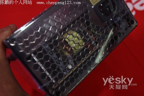 透过长城节电王专业版GW-4000电源侧面的蜂巢状散热孔可以看到这款电源在做个设计以及用料方面都十分不错,半桥式供电电路以及饱满的滤波电容历历在目。能达到严格的国际80PLUS认证的亲睐和内部电路的做个和设计不无关系,只有采用优质的元件精细的电路设计才能达到高达80%以上的电能转换率。