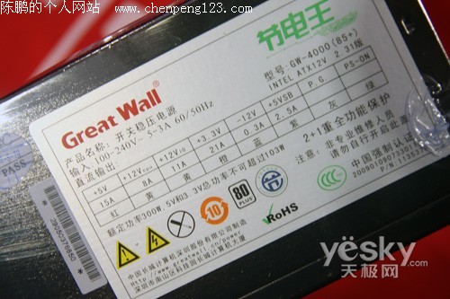在长城节电王专业版GW-4000电源的铭牌中我们可以清楚看到已经通过了国际80PLUS认证和国际环保ROHS认证,这两项权威性的国际认证代表了现代主流电源的实力。这款电源采用双12V供电设计,两路供电分别为8A和11A应对主流配置完全没有问题。输入电压为100V~240V类属于宽幅行列,这也是这款电源价格高于400SD很多的一个重要原因。夏季很多地区的电压不是很稳定,宽幅电源势必更有优势和卖点。