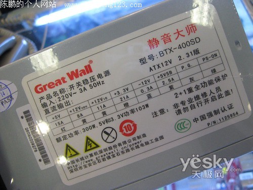 通过长城400SD电源的铭牌可以了解到这是一款额定功率为300W并符合intel最新ATX2.31版规范的电源产品。其5V和3.3V功率达到103W,完全足够应付一般的设备。