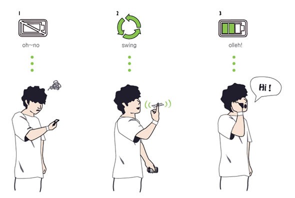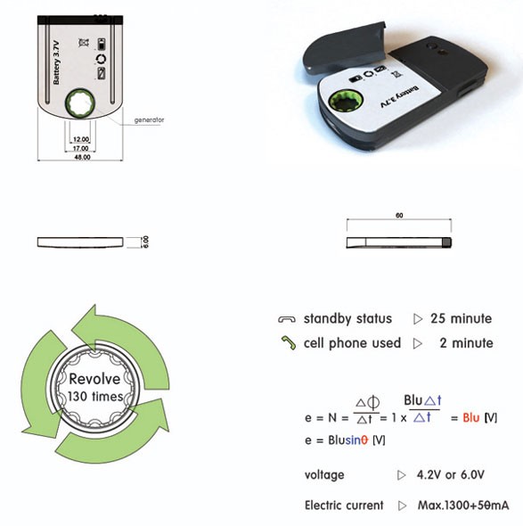 出门在外手机没电了该怎么办?不用着急,你只需将手机的电池取下来,套到手指上旋转一阵子,就能够为手机电池应急充电了!通过这种新奇的充电方式,每旋转130圈就能产生待机25分钟或是通话2分钟的电力。这款绿色概念产品由Song Teaho和Hyejin Lee设计。
