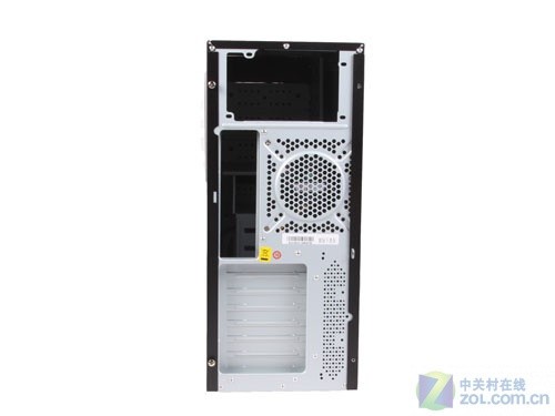 这款机箱采用市场上主流的上置电源设计,设有7个PCI扩展槽,并在背板开有可支持3种尺寸规格的散热风扇。