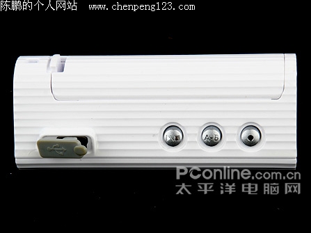屏幕上方相连的一个侧面,排布了播放停止键、A-B键,以及录音键共三枚按键,屏幕下方则还有一枚滑动式的HOLD锁定键,各按键呈圆形,比较小,键面上还刻有功能的标示,按压力度软硬适中,感觉做工和手感相当出色。