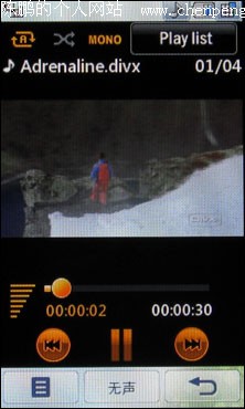 在视频播放方面,KU990来得要比音乐播放器更加不同凡响,从机身背面的标识我们可以知道KU990通过了Divx的认证,而且其支持Divx VGA分辨率的高清视频播放。另外,KU990还支持AVI、3GPP、MPEG4、H.263、H.264以及WMA等格式的视频播放,非常全面。在测试过程中,笔者专门为其下载了VGA分辨率的Divx视频进行测试,其播放画面清晰流畅,效果令人满意,而且在这个3英寸的屏幕上欣赏手机视频实在是一大享受。