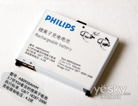 作为飞利浦的待机王Xenium系列中的一员,飞利浦9@9w配备了一块920毫安的电池,是这Xenium系列手机中首次出现千毫安以下的电池。在官方的宣传中飞利浦9@9w依然具备一个月的待机时间。在我们每天30分钟左右通话、20条短信、1小时音乐1小时电子书的使用频度下,飞利浦9@9w支持了5天时间。不过标准销售包装中有两块920毫安锂电池,轮换使用的话待机时间还是相当不错的。