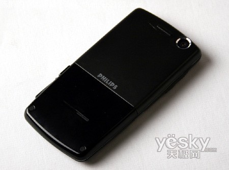 飞利浦9@9w机身背部的电池盖使用喷涂漆面的铝合金材质,而电池盖下部为天线位置,所以没有采用金属材料,这样的设计让背部上下两半的颜色看起来略有不同。背面非常简洁,右上角有摄像头开窗,中下部则有一个狭长的槽状扬声器开孔。