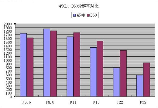 从图表可以看出搭配不同镜头的两部相机表现差别较大。在F5.6和F8.0时,450D要优于D60,但是差距不算很大。在F8时,450D达到最高值1868 LW/PH,D60同样达到最高值1805 LW/PH。在F11以后,D60分辨率表现要明显优于450D。D60的总体发挥更加平均,而450D在达到最高值后显现急剧下降的情况(这个情况应该和镜头的关系更大)。