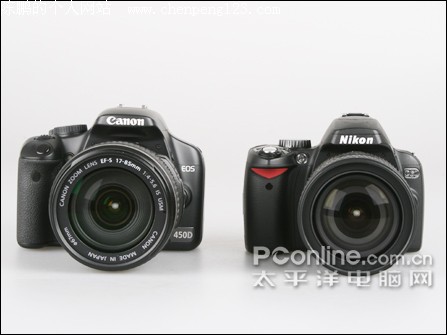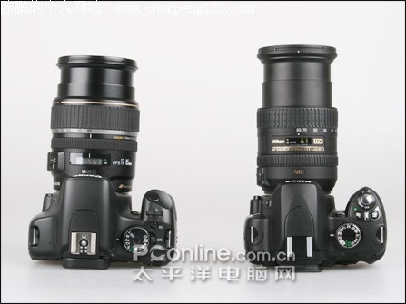 机身方面,两者表现相当。D60机身拥有尼康一向的磨砂质感,显得更为高贵,不像450D采用光滑处理显得玩具味浓。两者手感都较为良好。450D由于具有更多的快捷键,操作起来更加方便快捷。